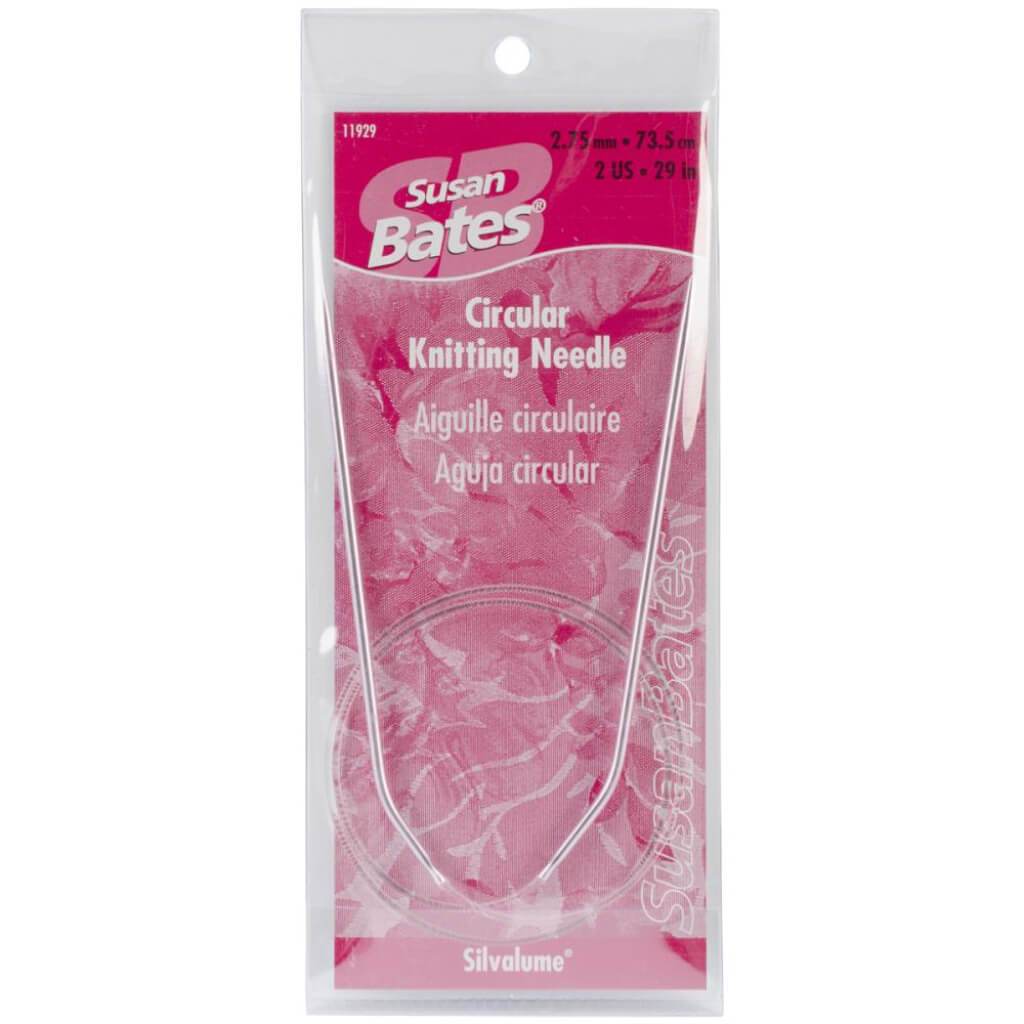 Susan Bates-Silvalume Circular Knitting Needles. Perfect for all your knitting needs. These knitting Needles offer The broadest range within The Susan Bates label. Size zero to ten and a half Silvalume Needles feature anodized aluminum shafts which are dyed to pastel colors. To minimize weight and enhance Stitching comfort; sizes eleven and up have plastic shafts.