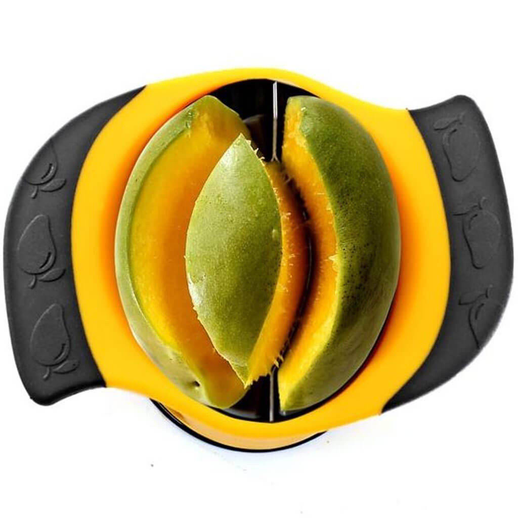 Just position the mango in the center with hole along the shape of the pit and press down firmly and evenly.