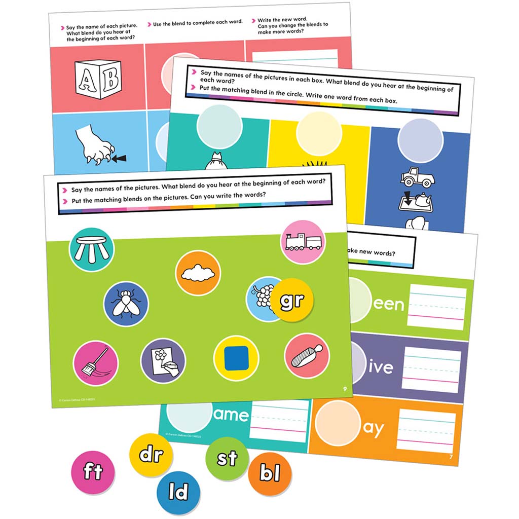 The Edu-Clings Silicone Center: Beginning and Ending Blends will support students' foundational reading skills as they work with common blends such as fl-, bl-, dr-, tr-, -nd, -mp, and more. This easy-to-clean, 25-piece resource provides a revolutionary hands-on learning experience for both at home or in the classroom. Each dry-erase mat measures 8.5 inches x 11 inches, with each manipulative measuring approximately 1.97 inches in diameter.