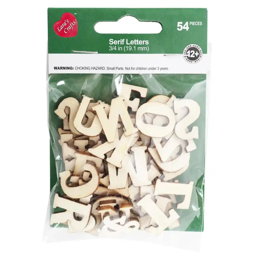 Personalize your projects with our group of wooden alphabet letters. Each letter features a classic serif font, adding a touch of sophistication to your creations. Spell out names, messages, or sentiments with this versatile set of 54 wooden alphabets. This package contains 54 unfinished wood alphabet blocks measuring 0.75 inches.