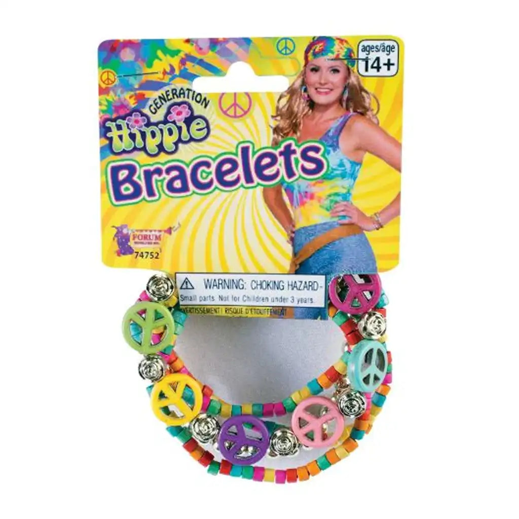 Add the perfect look to your 60's costume with these Hippie Bracelets! These bracelets feature colorful wooden beads, peace signs, and metallic gold beads. Includes 5 bracelets. One size fits most.