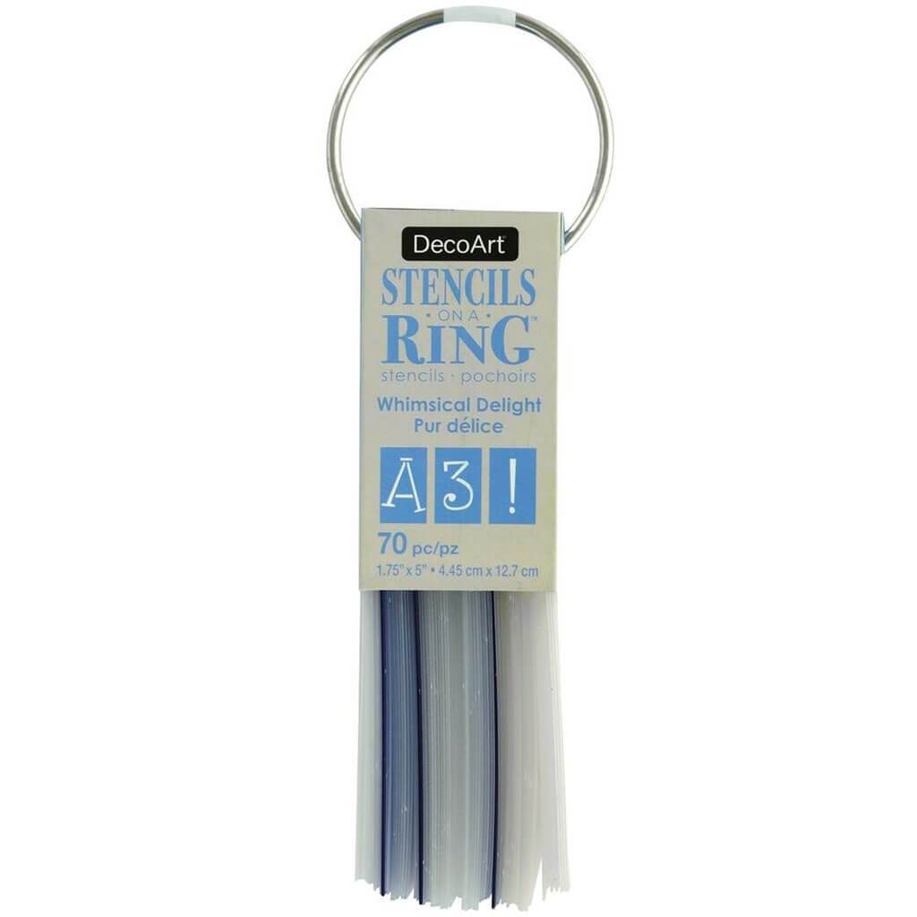 Stencils to paint on any project. It is as easy as 1-2-3. Basecoat the project, position the stencil and apply paint. These durable stencils can be used over and over. Great for kids as well as adults. Americana Stencils on a Ring Whimsical Delight- Stenciling on-the-go is easier than ever with these stencils on a ring. Plastic alphabet stencils with each letter, number, and punctuation mark on a separate sheet are secures on a detachable jump ring. The ring contains an entire alphabet font in both uppercase and lowercase, numbers 0 through 9, and eight punctuation marks. Uppercase letters are approximately 2" tall.