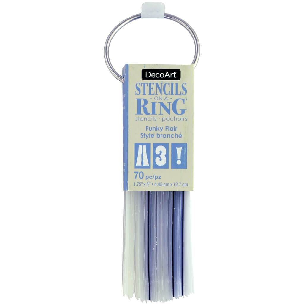 Stencils to paint on any project. It is as easy as 1-2-3. Basecoat the project, position the stencil and apply paint. These durable stencils can be used over and over. Great for kids as well as adults. Americana Stencils on a Ring Funky Flair- Stenciling on-the-go is easier than ever with these stencils on a ring. Plastic alphabet stencils with each letter, number, and punctuation mark on a separate sheet are secures on a detachable jump ring. The ring contains an entire alphabet font in both uppercase and lowercase, numbers 0 through 9, and eight punctuation marks. Uppercase letters are approximately 2" tall.