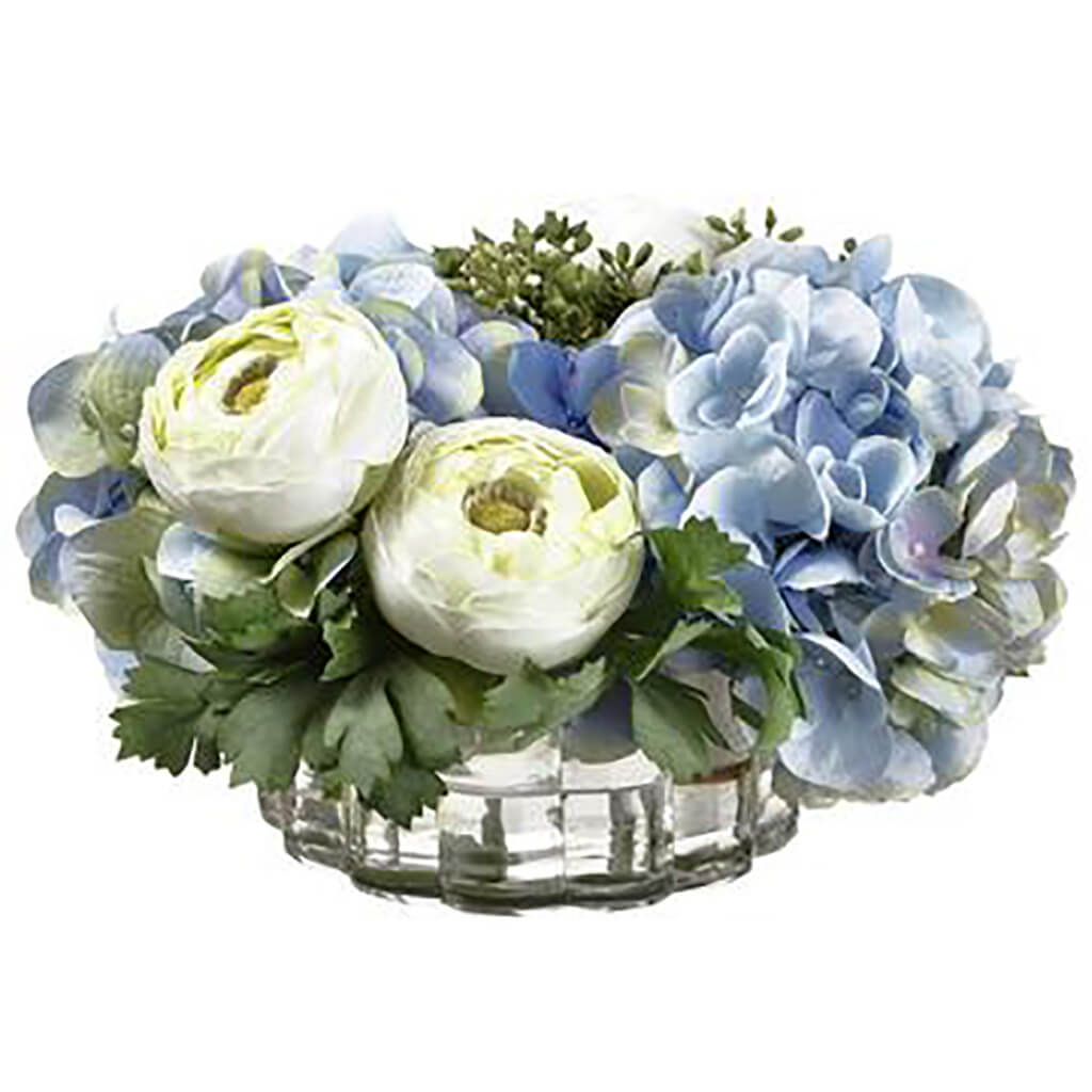 6.5in hx10in wx10in l Hydrangea/ Ranunculus Arrangement in 3.5in hx6in d Ribbeed Glass Vase Blue
