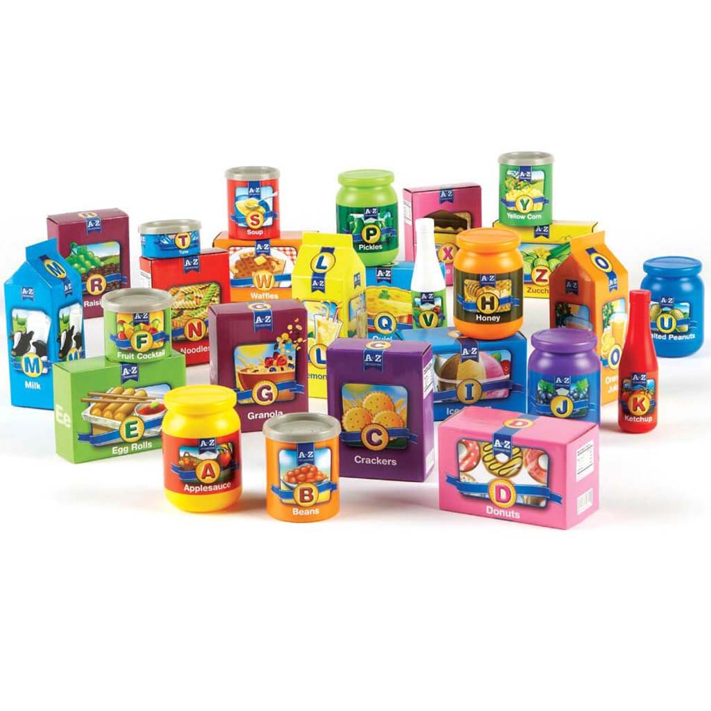 Learning letters has never been so fun! Colorful, realistic groceries provide a fun way to introduce early language skills and inspire hours of imaginative play. Each of the 26 groceries is labeled with a letter, word, and colorful picture. Great for reinforcing letter recognition, everyday vocabulary, and creative role-play. Cartons measure 6½“H; jars measure 4”H.