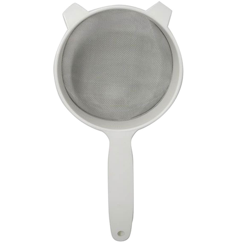 Stainless steel mesh. Frame and handle made of durable plastic.