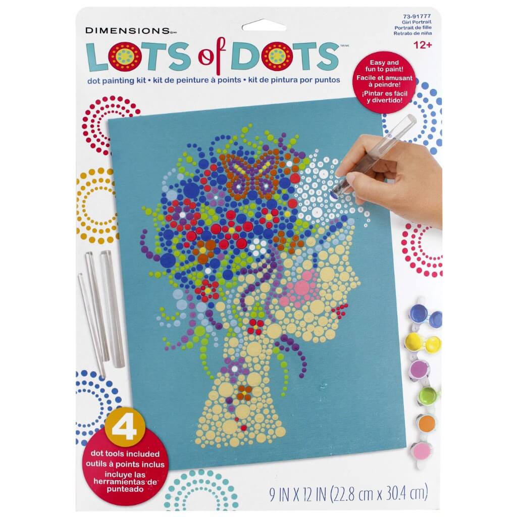 Simply match each tool to the same size circle on the board and dot away! Finished size: 9x12 inches. Kit includes printed board, acrylic paints, 4 dot painting tools, and instructions.