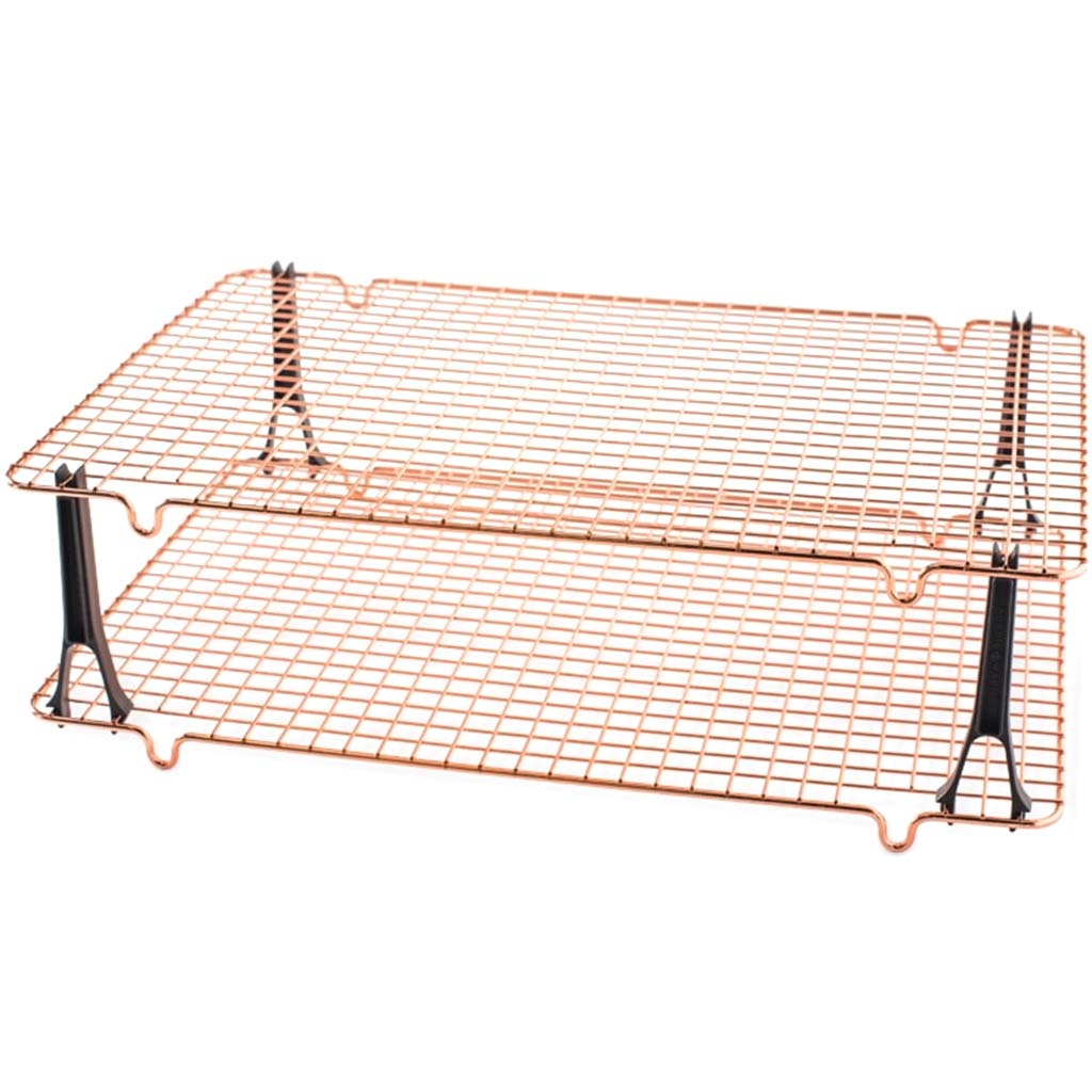 What’s better than one tray of cookies? Two! Especially when they’re efficiently layered in one footprint. Maximize counterspace and storage with these stacking cooling grids. Features two copper plated grids and four black snap-in stackers. Cool two-tiers of baked goods at once! Durable and easy to store. Stackers snap together to stow away in a drawer until you bake again. Perfect for baking in quantity in small kitchens.