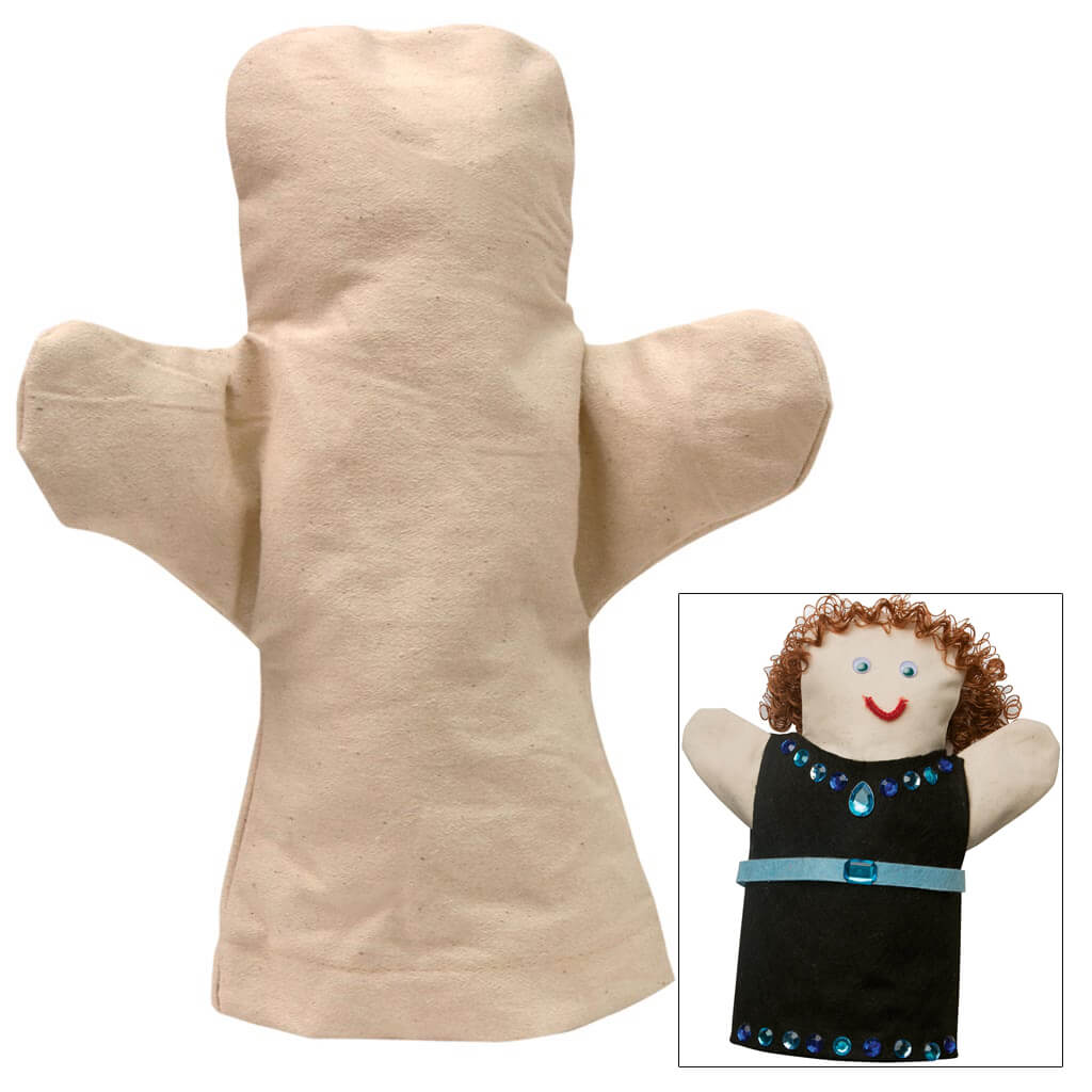 Heavyweight 7 ounce poly cotton twill canvas puppets guarantee hours of fun. Puppets can be painted and embellished with glued-on pieces.