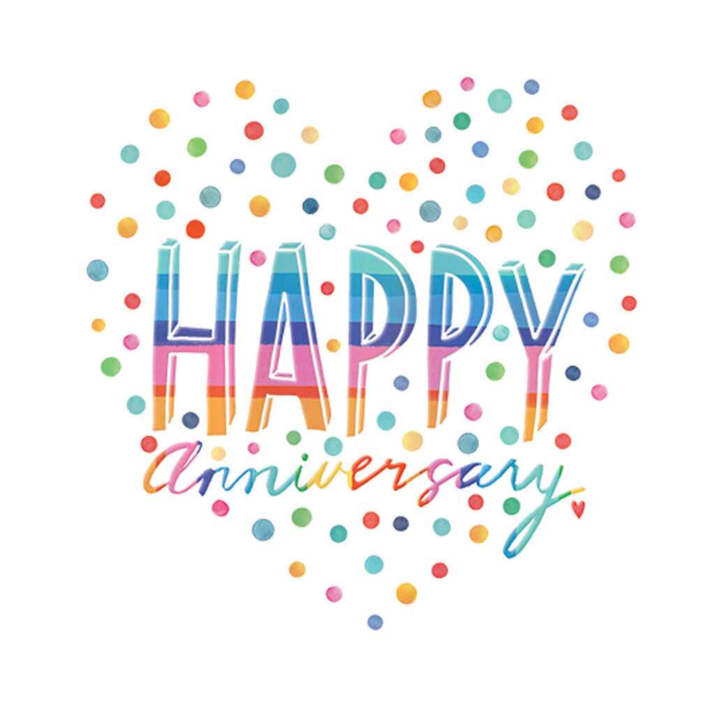 This playful anniversary card features a heart made of rainbow dots with celebratory text in the center! Embossed details and clear holographic foil add extra touches of style, perfectly complementing the message of congratulations inside!