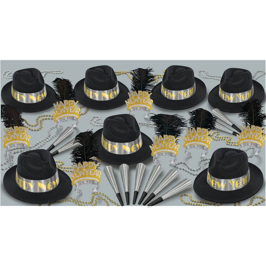 • 25 - Velour Fedoras w/Printed Foil Band, 25 - Glittered Plumed Tiaras, 50 - 9" Foil Horns, 25 - 33" Party Beads