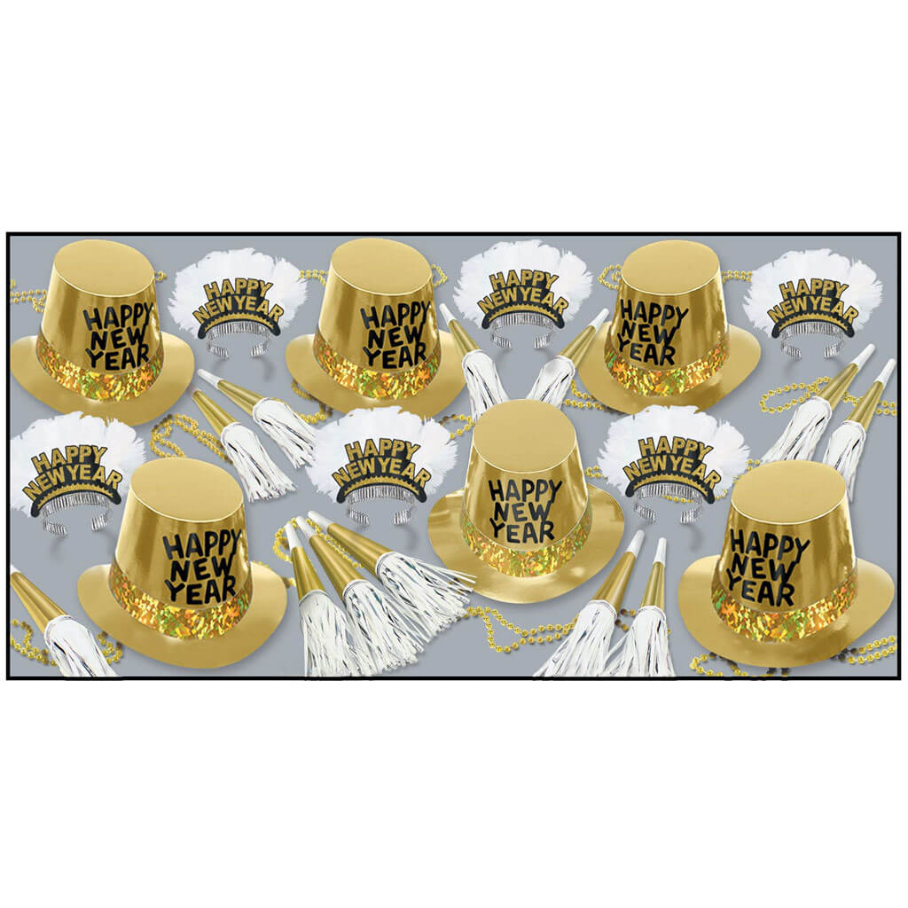 13 - Foil Hi-Hats w/Prismatic Band, 12 - Feathered Tiaras, 25 - 9" Tasseled Foil Horns, 12 - 33" Party Beads