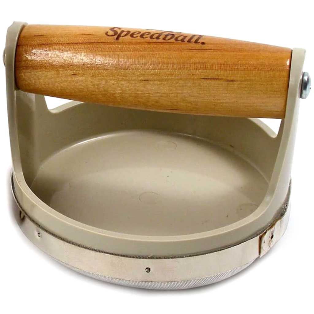 A 4 inch diameter baren made of heavy-duty plastic padded with foam, polyethylene and covered with a nitrex nylon. This premier baren offers shock absorbant, smooth slide and washability. Ideal for hand printing. Puts pressure on page evenly for a better ink image.