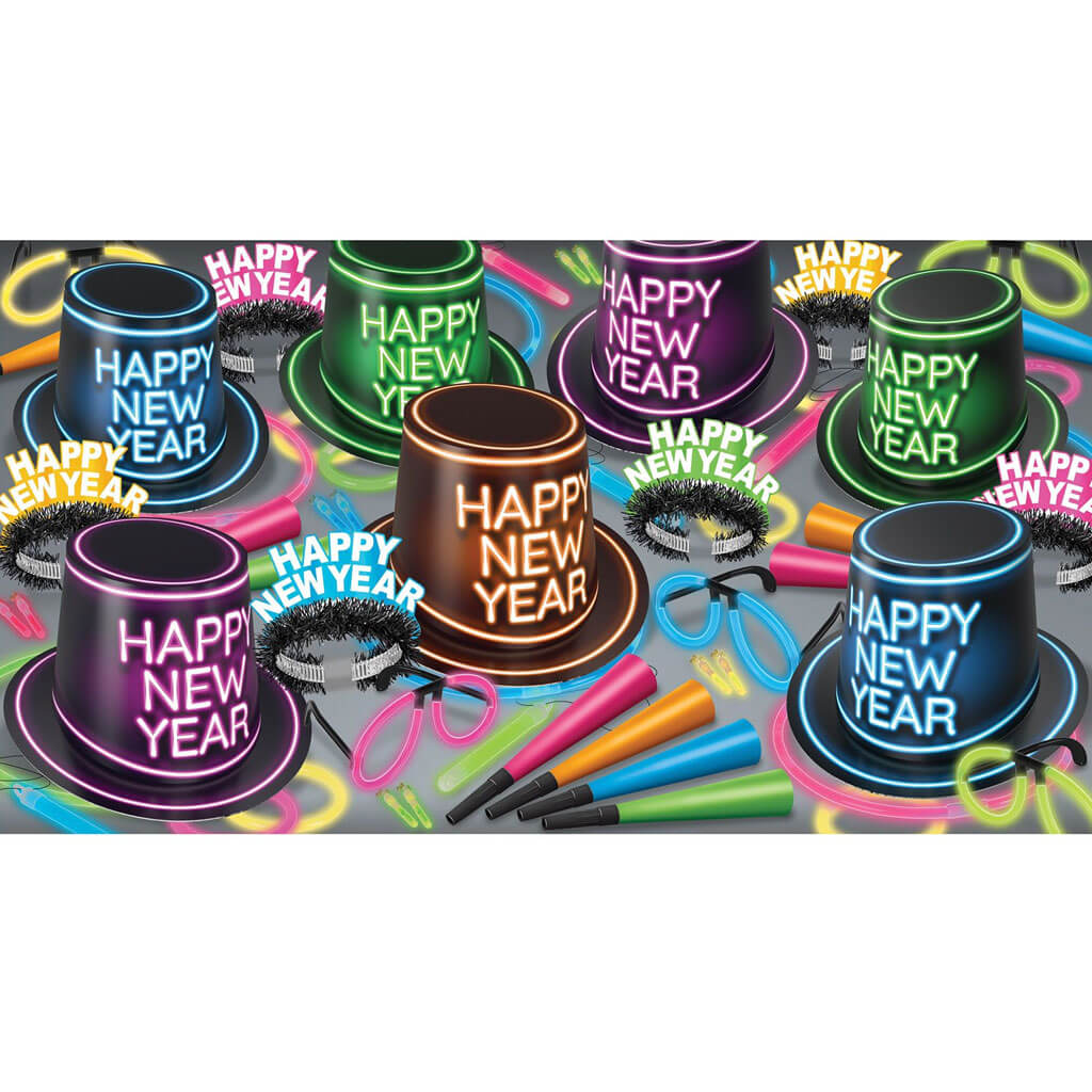 • 25 - Printed Hi-Hats, 25 - Printed Fringed Tiaras, 50 - 9” Printed Horns, 48 - Glow Accessories: 8 Pairs Glow Eyeglasses , 8 Pairs Glow Earrings, 16 – 8" Glow Bracelets, 8 – 4" Glow Sticks, 8 – 22" Glow Necklaces, (Neckaces Created by Connecting 2–11" Glow Sticks)