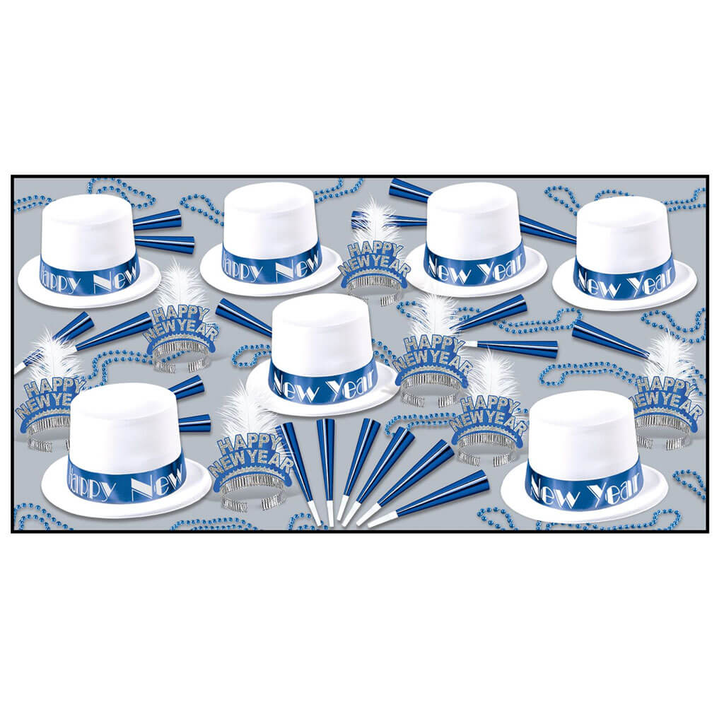 • 25 - Velour Toppers w/Printed Foil Band, 25 - Glittered Plumed Tiaras, 50 - 9" Foil Horns, 25 - 33" Party Beads