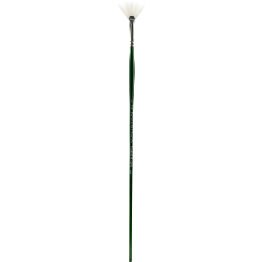 Synthetic bristle hairs are interlocked for resilience and control. Silver ferrules with green handles.