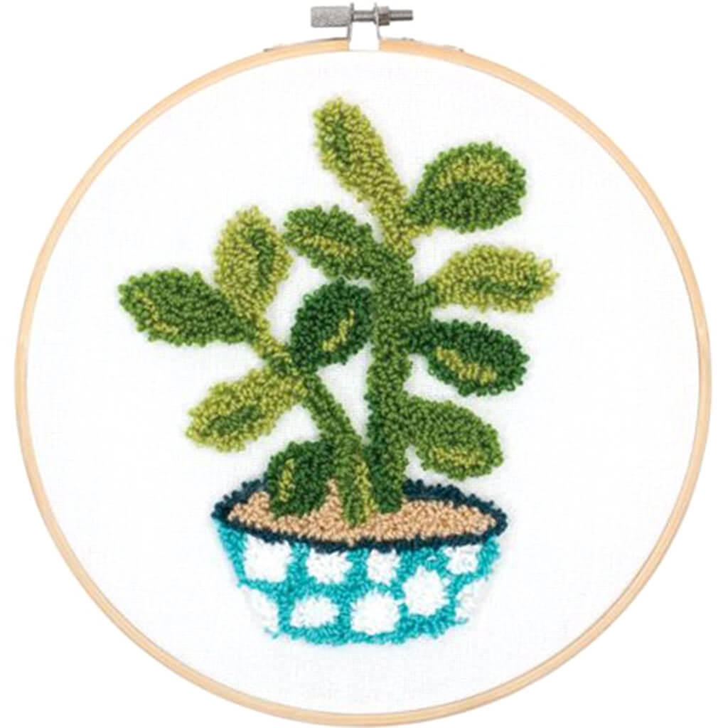 Dimensions Punch Needle Embroidery for dimensional designs. Kit Jade- Kit contains presorted wool yarn, printed fabric, and instructions. Features a jade plant in a pot. Requires: DIM73100 Dimensions Punch Embroidery Needle & Threader and 8 in. embroidery hoop, each sold separately. Finished size approximately 8 in. x 8 in. Printed side of the fabric is the back, making it easy to stitch your pattern while creating loops on the front.