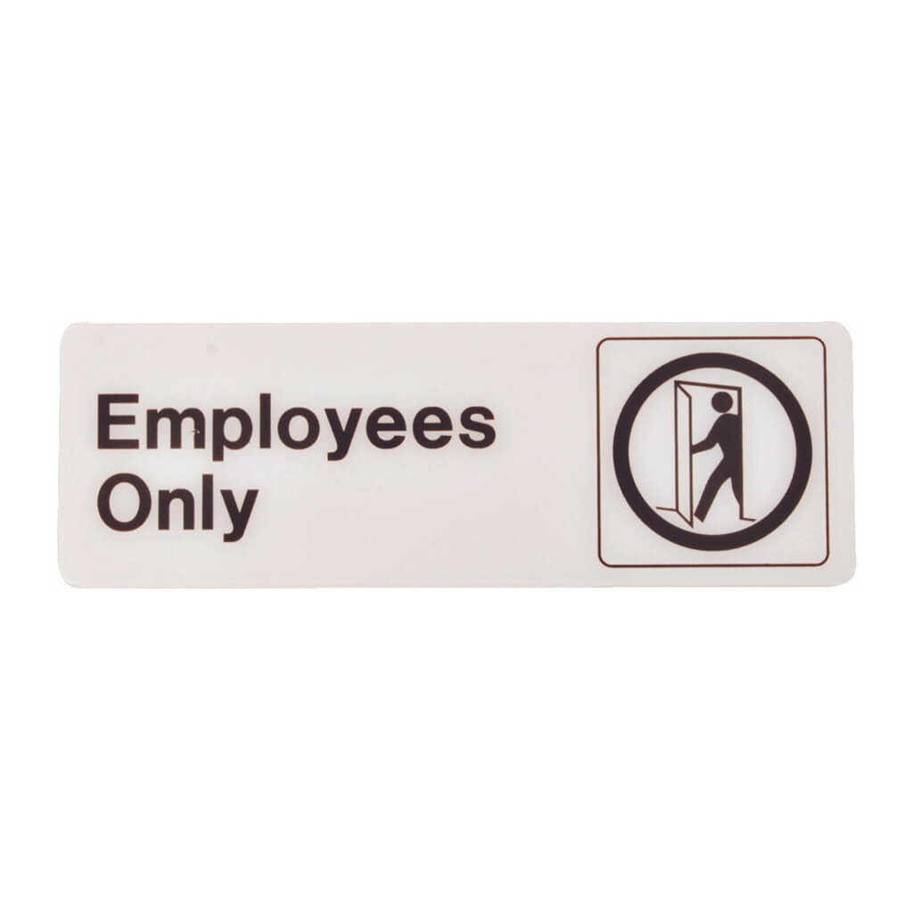 Wipe clean polished finish. Self-adhesive strips for mounting. Use in factories, hospitals, hotels, offices, restaurants and more. White background with brown lettering/symbol which states "Employees Only".