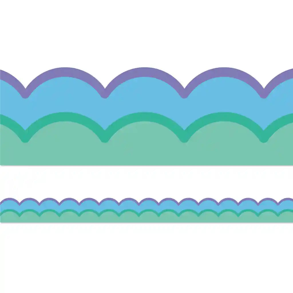 Ideal for bulletin board, white board, cork board, and chalkboard displays, the bulletin board borders are printed on thick but flexible paper that can be cut and layered to add dimension to any display. The bulletin board borders set includes 13 strips of scalloped, 3’ x 3” green and blue border trim with a purple and green border for a total of 39 feet of bulletin board border.