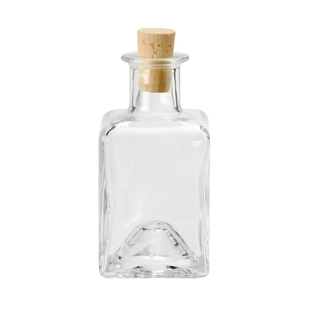 Square clear glass bottle with a cork stopper. It can be filled with various liquids or bath salts and decorated with ribbons, fairy lights, and confetti.