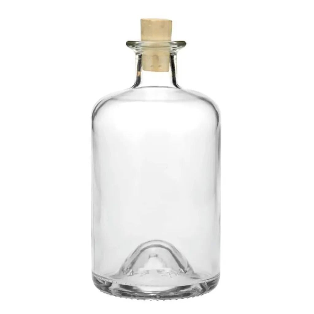 Round clear glass bottle with a cork stopper. It can be filled with various liquids or bath salts and decorated with ribbons, fairy lights, and decorative scatter elements.