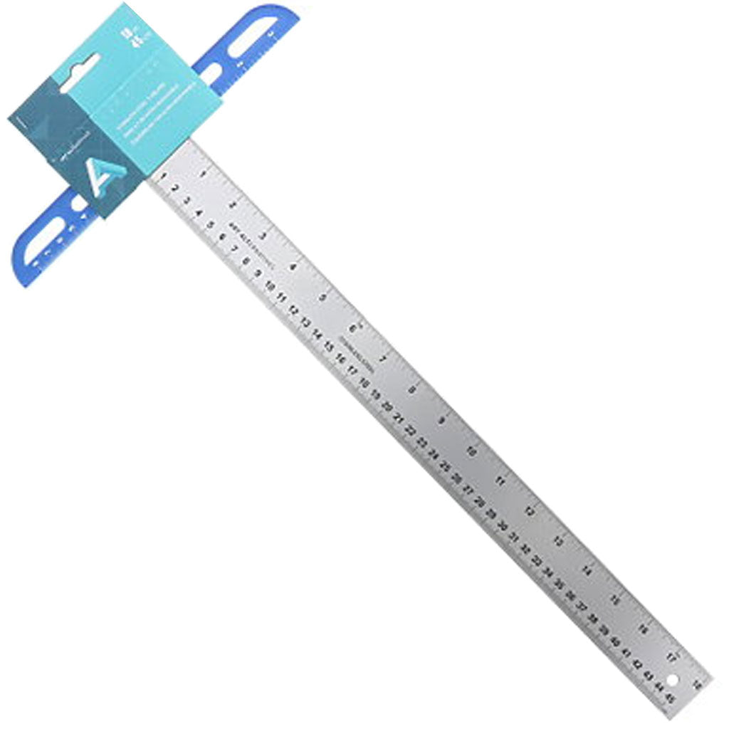 These T-Squares have a stainless steel blade for accurate line drawing and cutting, a single hole for hanging and a plastic blue head. The blade features graduated inch markings in 16ths and 32nds on one side and centimeter markings on the other. The head has 1/8" markings on one side and millimeter markings on the other.